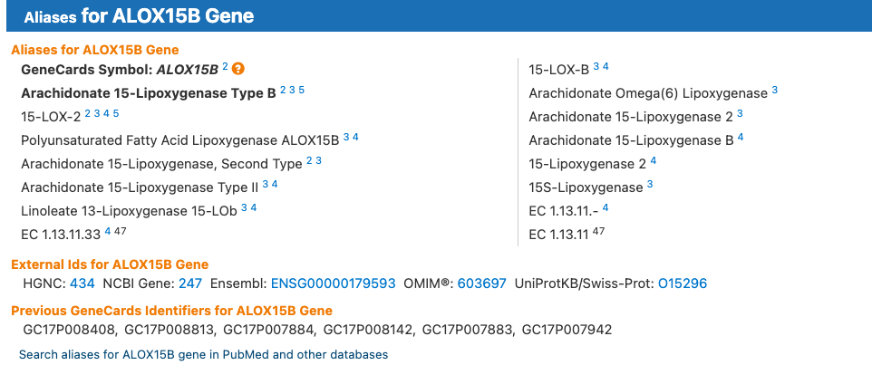 Take a few minutes to explore the GeneCards page for ALOX15B and see what information you can find about the gene. What is its function? Where is it expressed? Does it interact with any other proteins? Checkout some of the links to other databases and see what information you can find there as well.