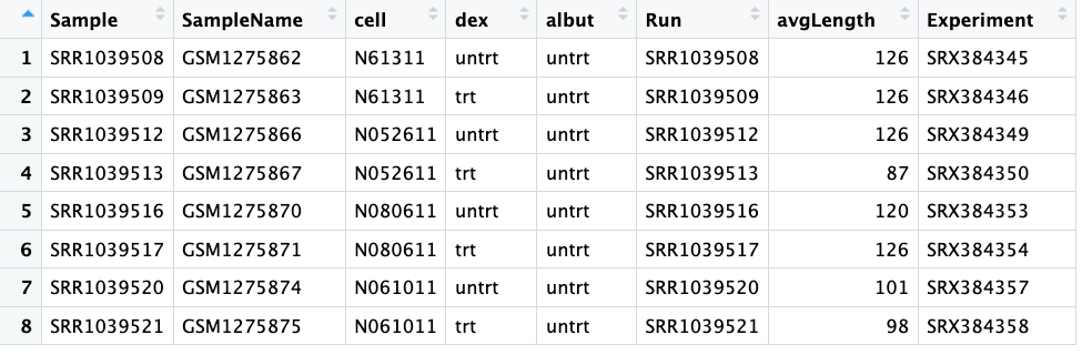 We can see that there are four unique cell lines used in this experiment, and for each cell line, there was one untreated and one dexamethasone treated sample. This is an important part of robust experimental design – each cell line could respond differently so you need to control for this by testing every condition on all cell lines.