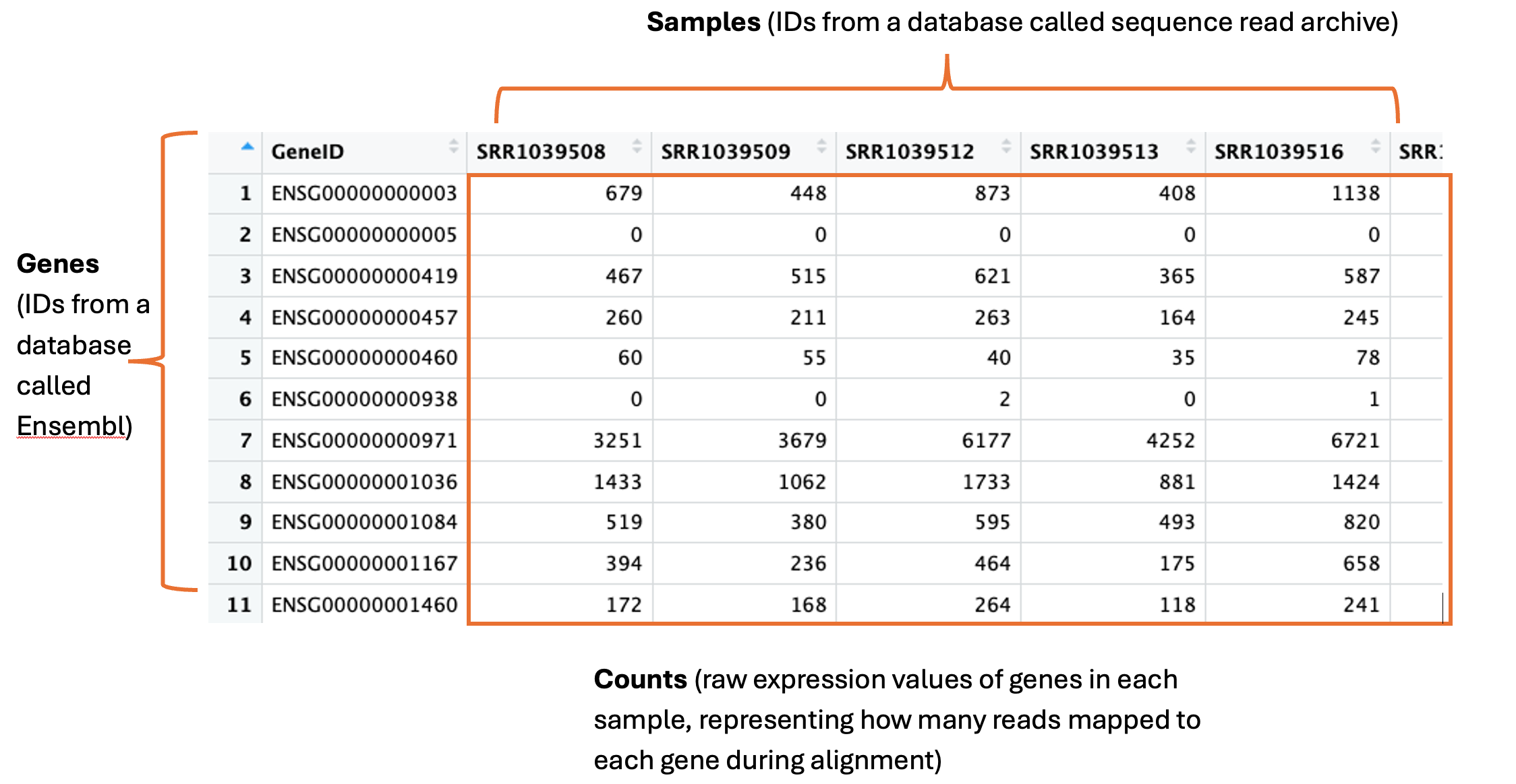 The numeric values in the table are the counts. This is the unprocessed, raw expression data for our genes. A single count corresponds to 1 sequence read mapping to that gene in the genome during a process called alignment. This is the initial step in RNA-seq, where the sequence read data are first ‘aligned’ to the genome using high performance computing. These counts are one of the main outputs from this process and what most researchers then go on to use for all downstream analyses.