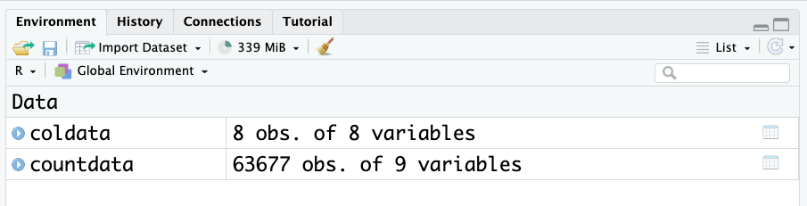Look at the environment panel. How many rows and columns are there for the coldata and countdata objects? (Observations = rows. Variables = columns.)