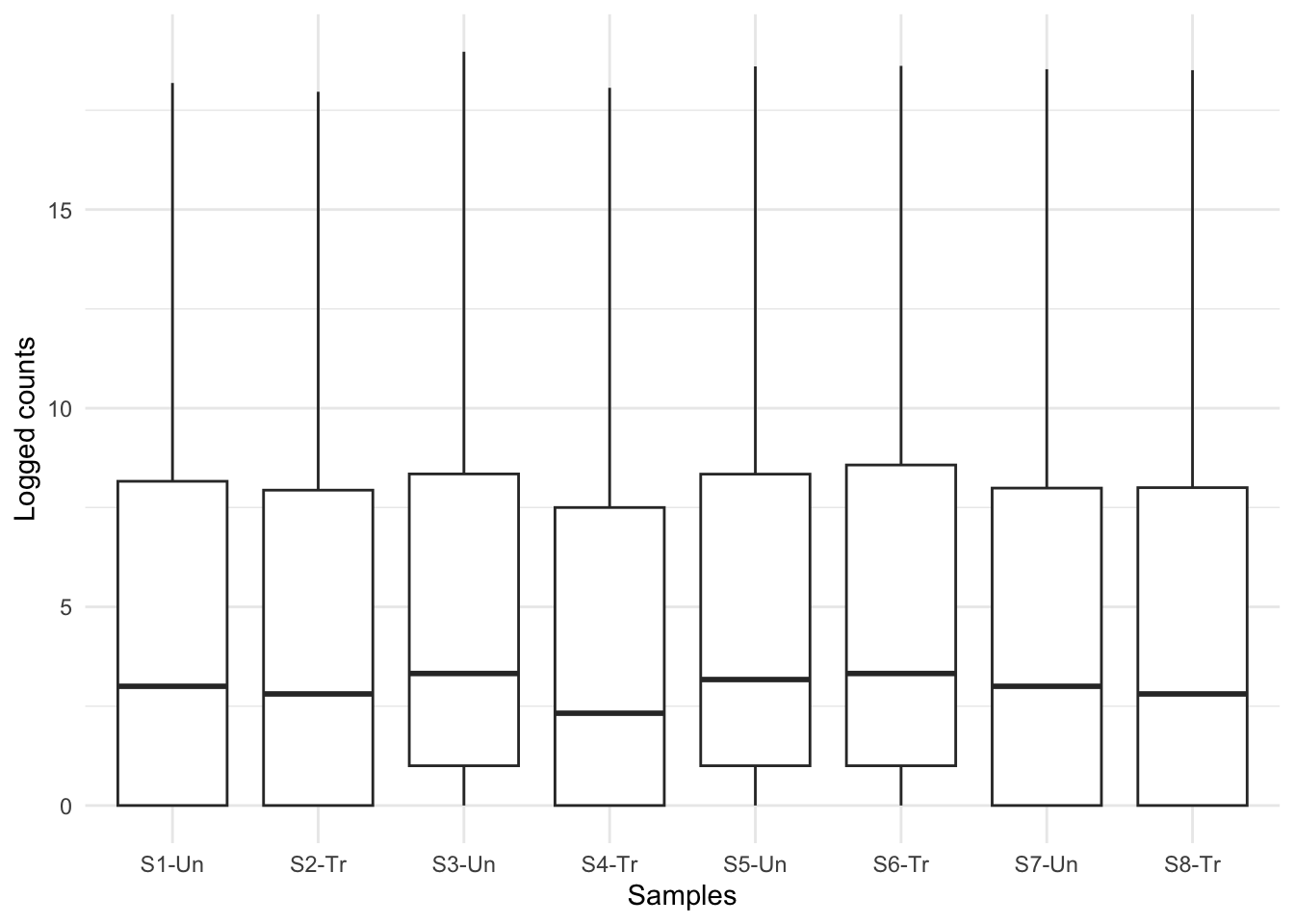 # Create boxplot with ggplot2ggplot(data = counts_long, mapping =aes(x = Sample, y = Counts)) +geom_boxplot() +labs(x ="Samples", y ="Counts") +theme_minimal()