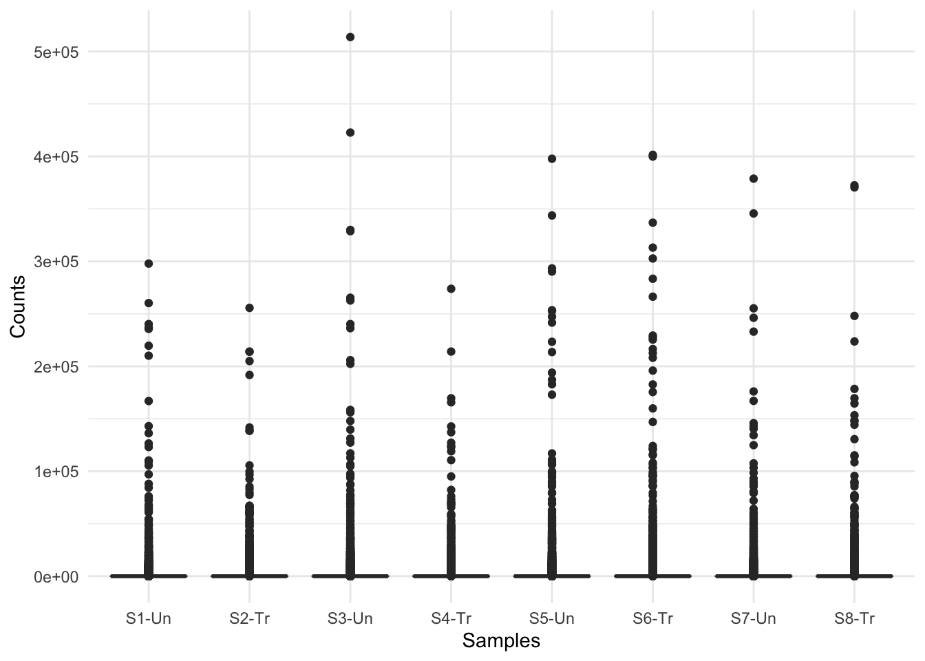 # Convert counts data to long format for ggplotcounts_long <- countdata %>%pivot_longer(cols =-GeneID, names_to ="Sample", values_to ="Counts")