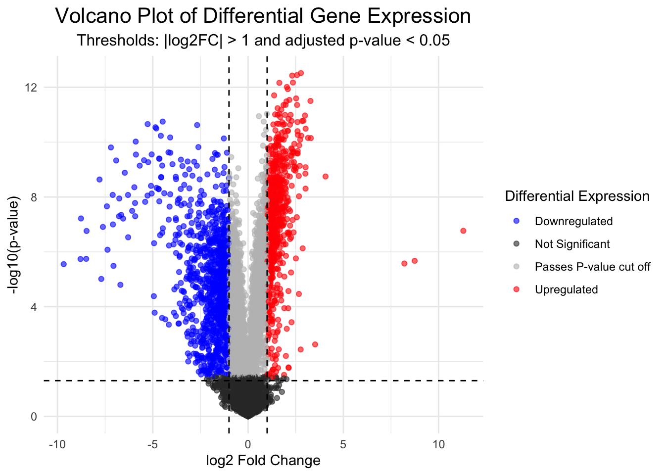 Statistical significance is often not the only measure we will use to call genes differentially expressed. It is common to apply an additional threshold of gene expression needing to double or halve to be considered differentially expressed. On the log2FC scale, this is log2(2) (i.e., a value > 1 or < -1).