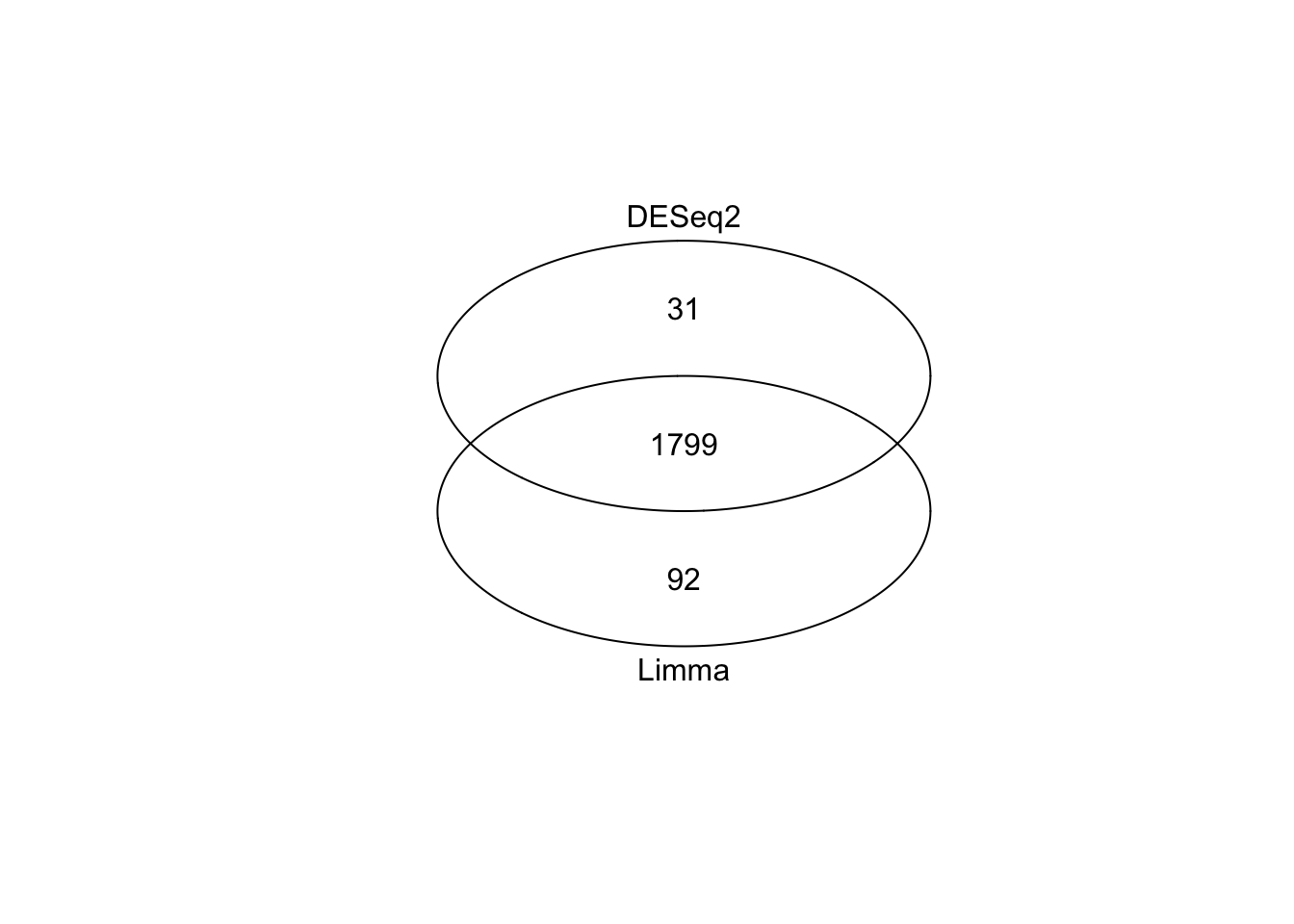This is very strong concordance between our two methods and gives us high confidence in our approach. At this point you could take the overlap (n = 1799 genes), take all genes (n = 1799 + 31 + 92), or take genes from just one method (more relevant if one method was conservative compared to the other). Exactly how you resolve this step will depend on the exact shape of your venn diagram and your context.
