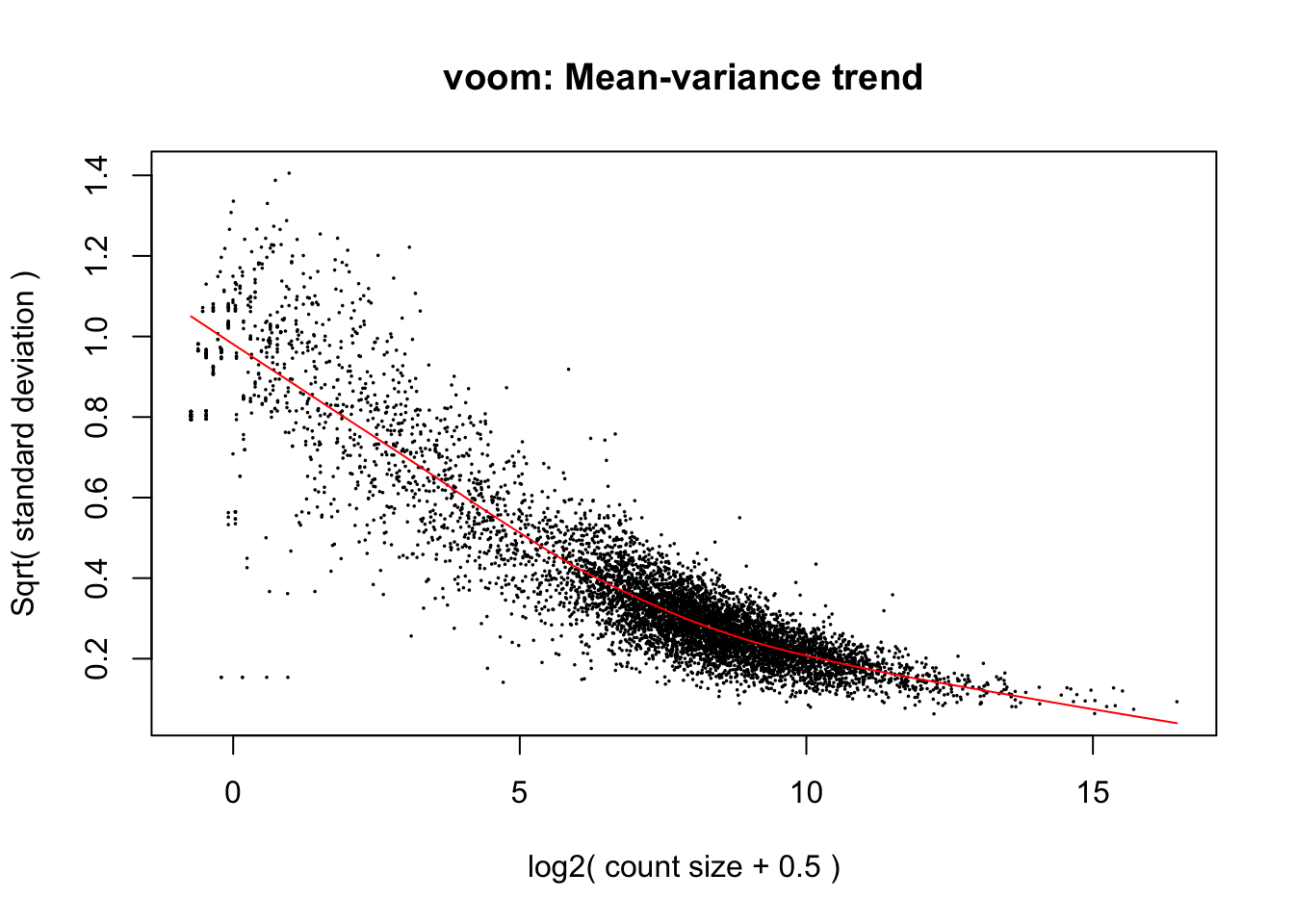 This plot highlights an earlier point about heteroscedasticity. For genes with low expression, the variance (here the square root of the standard deviation) is highly variable. Because the variance is dependent on the mean, we describe this data as heteroscedastic. Our v (voom) object contains information relating to the curve line (red) and makes an adjustment factor, so that the data will have a uniform relationship between the mean and variance.