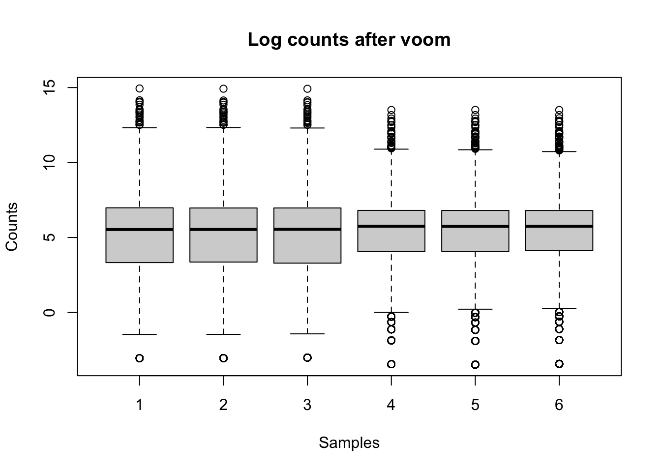 boxplot(v$E ~ col(v$E), ylab = "Counts", xlab = "Samples", main = "Log counts after voom")