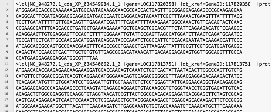 FASTA file containing cds data from a genome, opened in a text editor. Each sequence is preceded by one header line, beginning with an ‘>’ symbol.