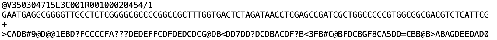 The second line is the actual sequence. Count the number of bases –which read length was chosen for this dataset?