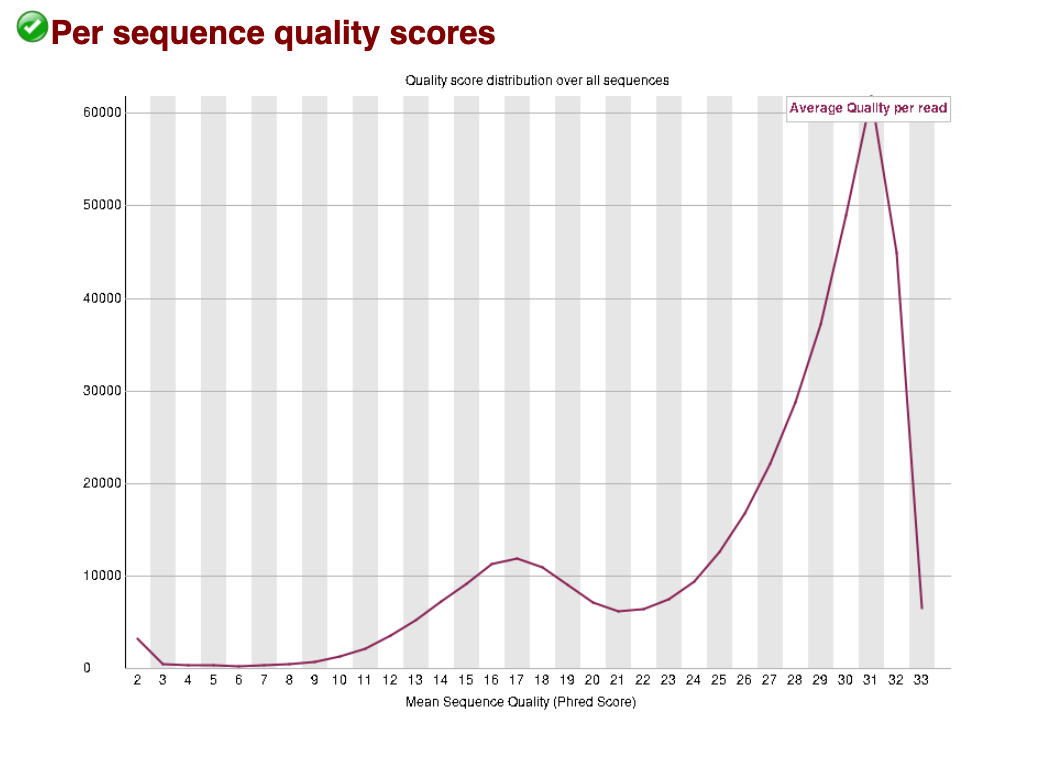 For the bad data, we can see that the larger peak of reads sits at a slightly lower (and wider) Q score, and there is a second peak at a very poor score of around Q17. These data show us that there may be a large proportion of reads with a high Q-score retained after trimming (good news!). The data has been given a ‘pass’ by FastQC, indicating it has not dropped below the threshold for this category to be given a warning or fail.