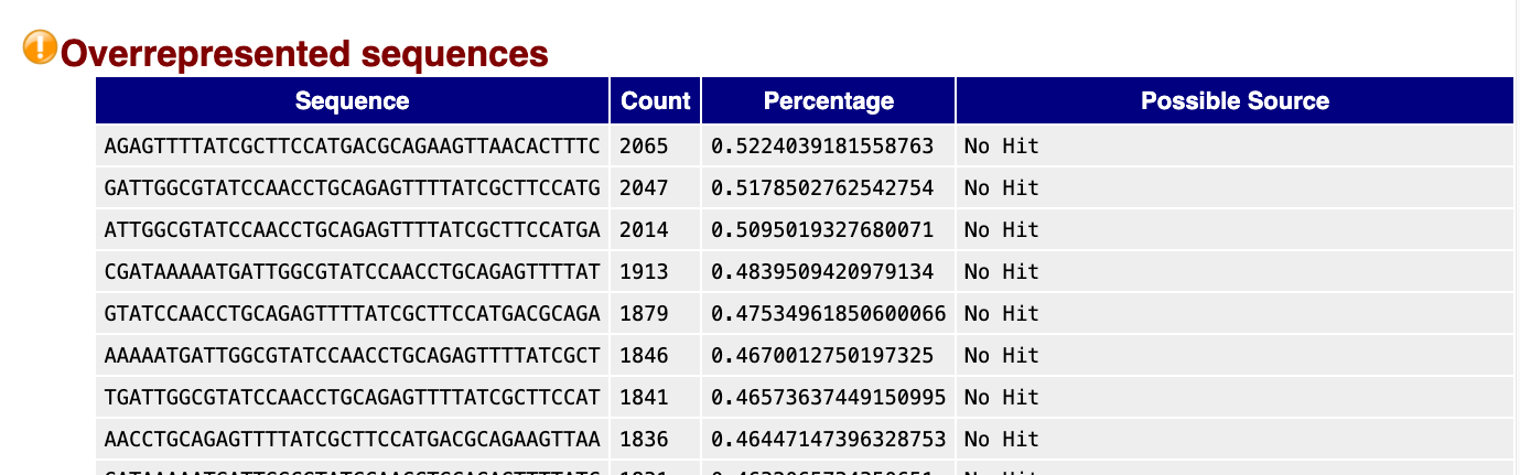 Here is a snippet of our bad data, showing a ‘warning’ with multiple overrepresented sequences detected, and the count and percentage of the total reads is also shown: