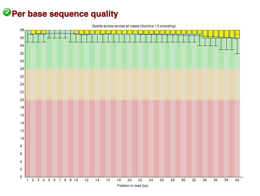 In this ‘good data’ below, all boxplots sit easily in the green range. These reads are excellent quality (i.e., the sequencing itself worked very well).