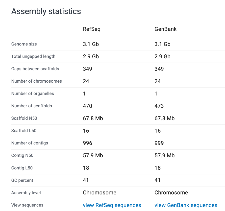 - Complete genome – all chromosomes are resolved with no gaps. Not necessarily telomere-to-telomere (T2T). Very rare to have a complete genome assembly.
