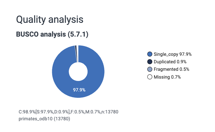 Completeness can be measured in multiple ways, but it is often measured using a BUSCO (Benchmarking Universal Single-Copy Orthologs) score. This measures completeness using sets of conserved, single-copy genes expected to be present in most species within a specified lineage, which are reported as percentages of complete, duplicated, fragmented, and missing genes, to a total of 100%. Essentially, we check to see if a bunch of genes we expect to see in every species are present in our assembly.