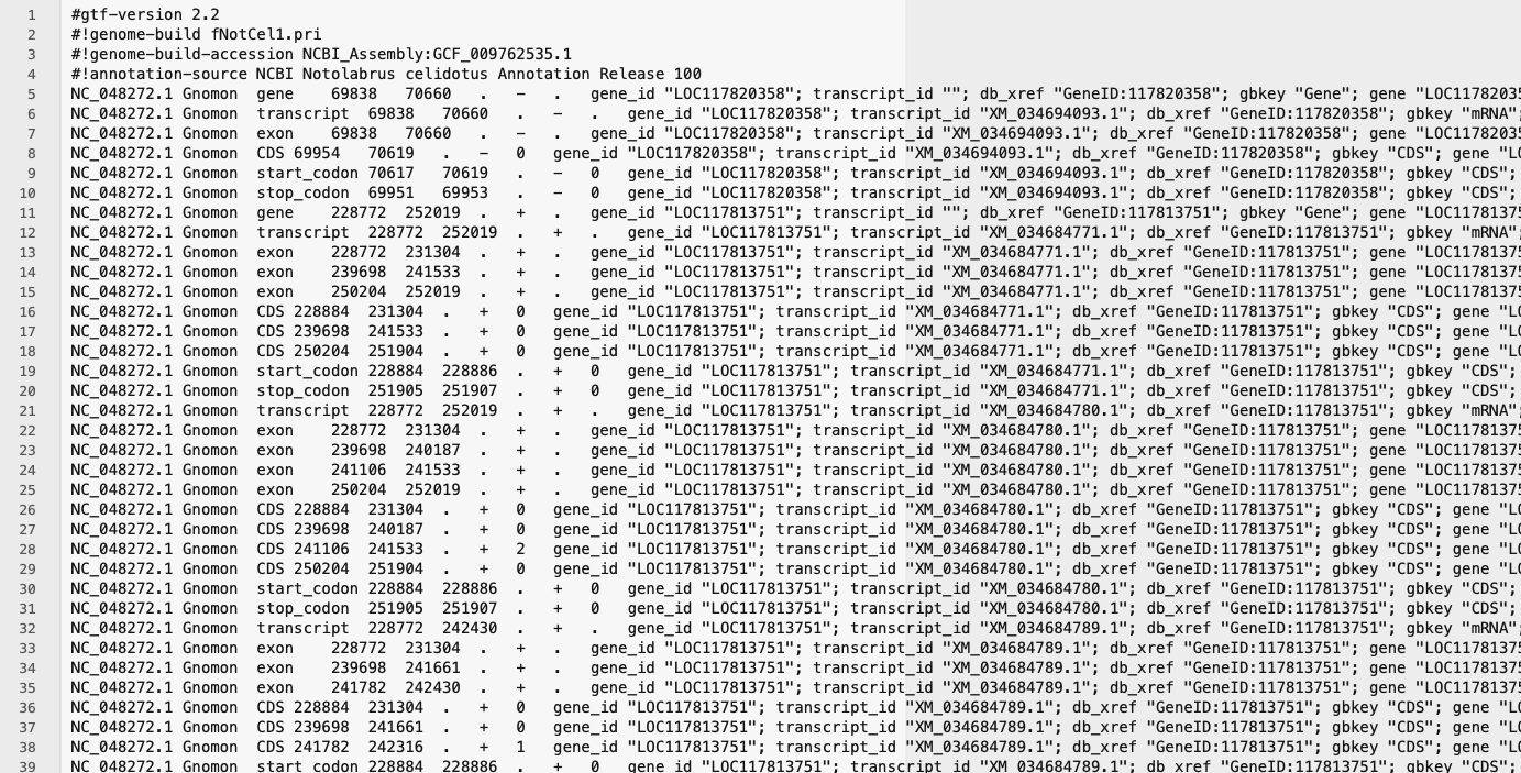 GTF file opened in a text editor. Note all lines in the header section start with a ‘#’ symbol. Generally each GTF file you encounter will all have 4 or 5 lines in the header section, but the alignment section will vary in size based on number of annotations.