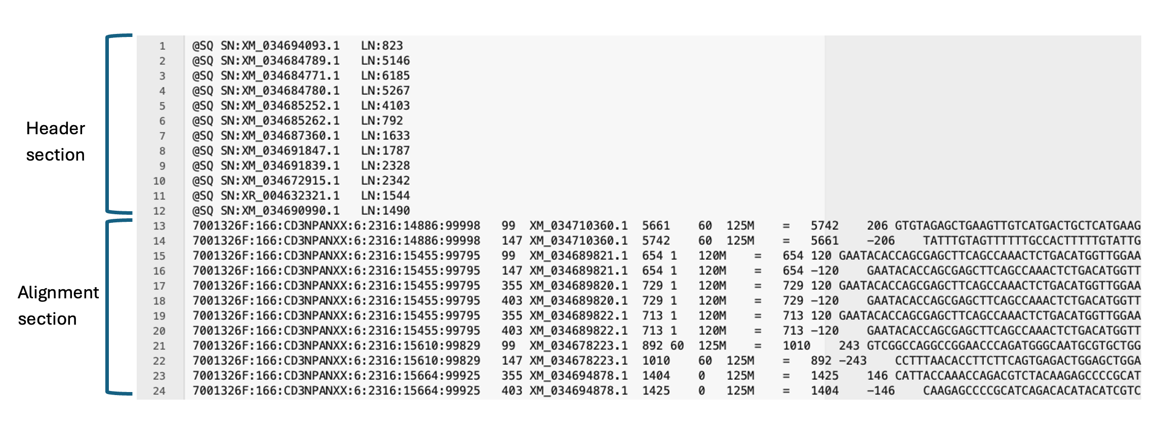 SAM file, opened in a text editor. Note all lines in the header section starts with an ‘@’ symbol, and the number of lines in the header section is variable. There are 11 mandatory fields in the alignment section (not all visible here).