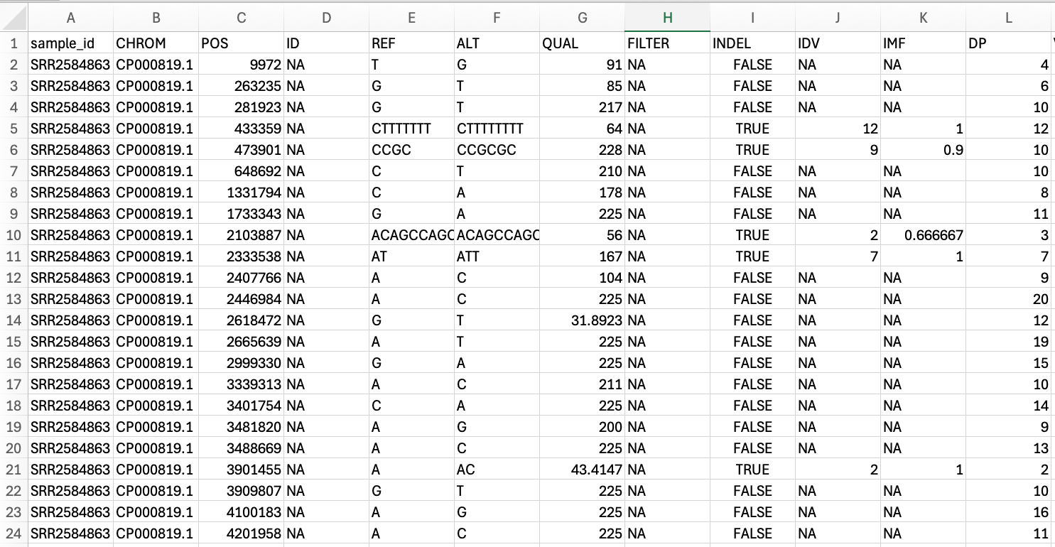 VCF file opened in excel. Instead of the header sections seen in the other file types, here each column has a name.