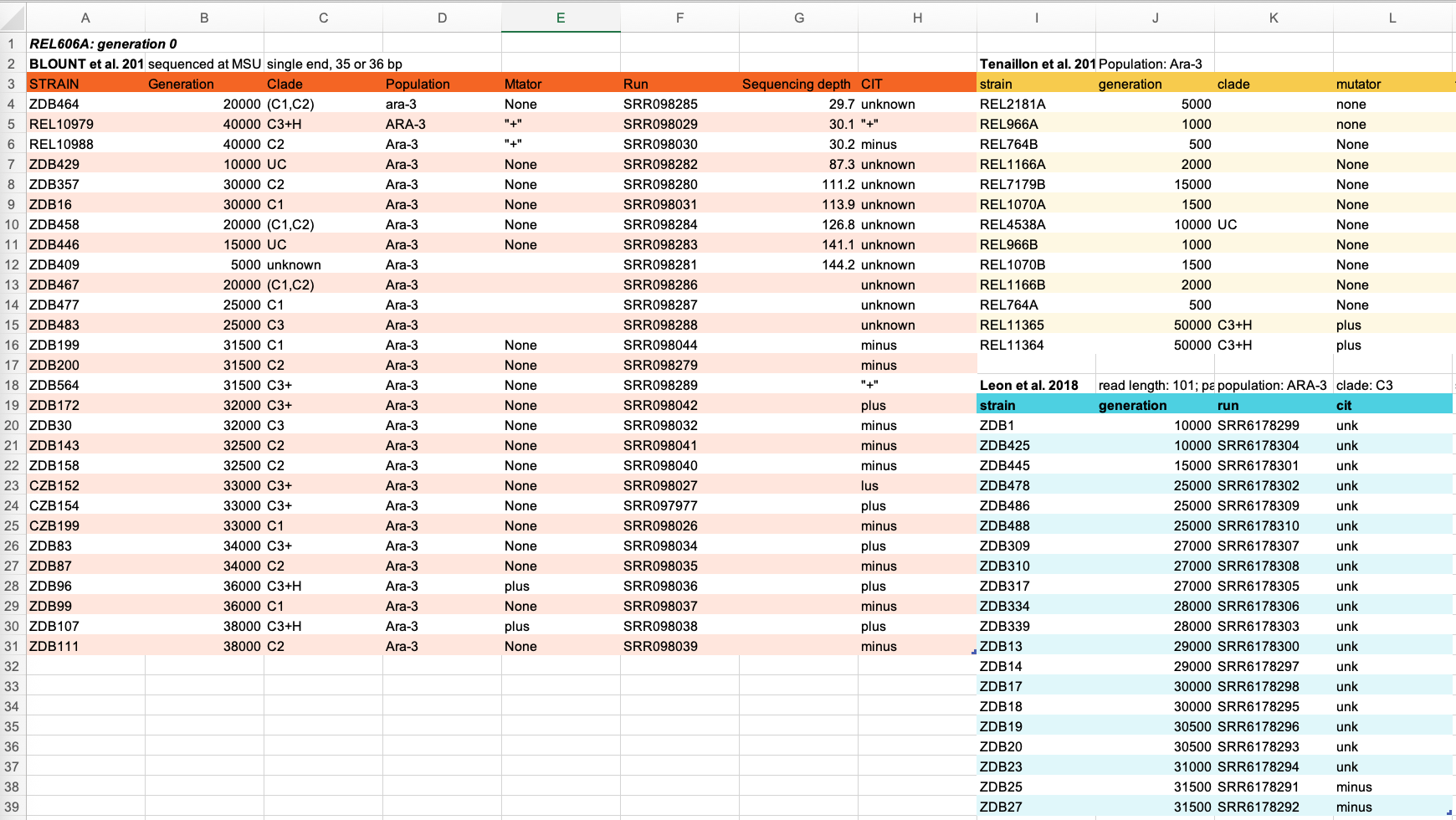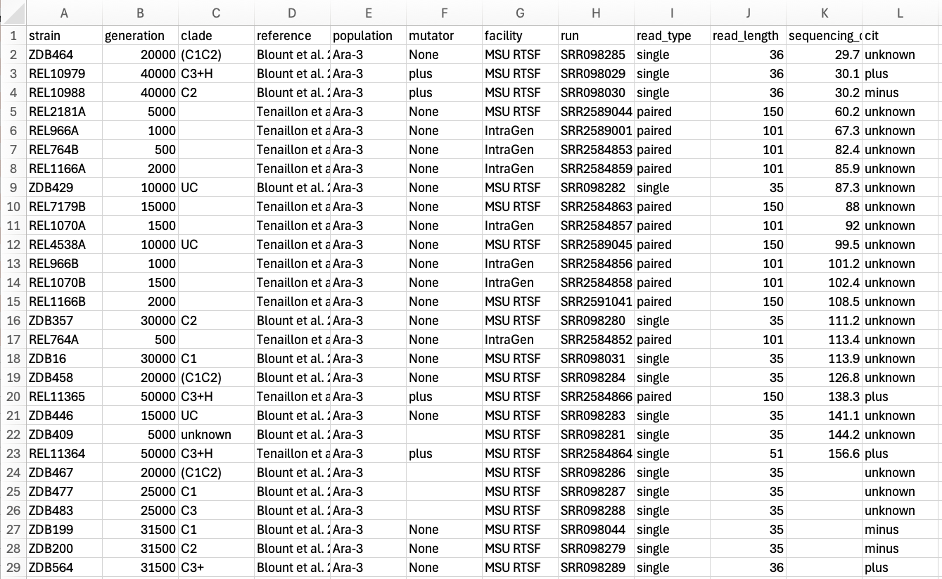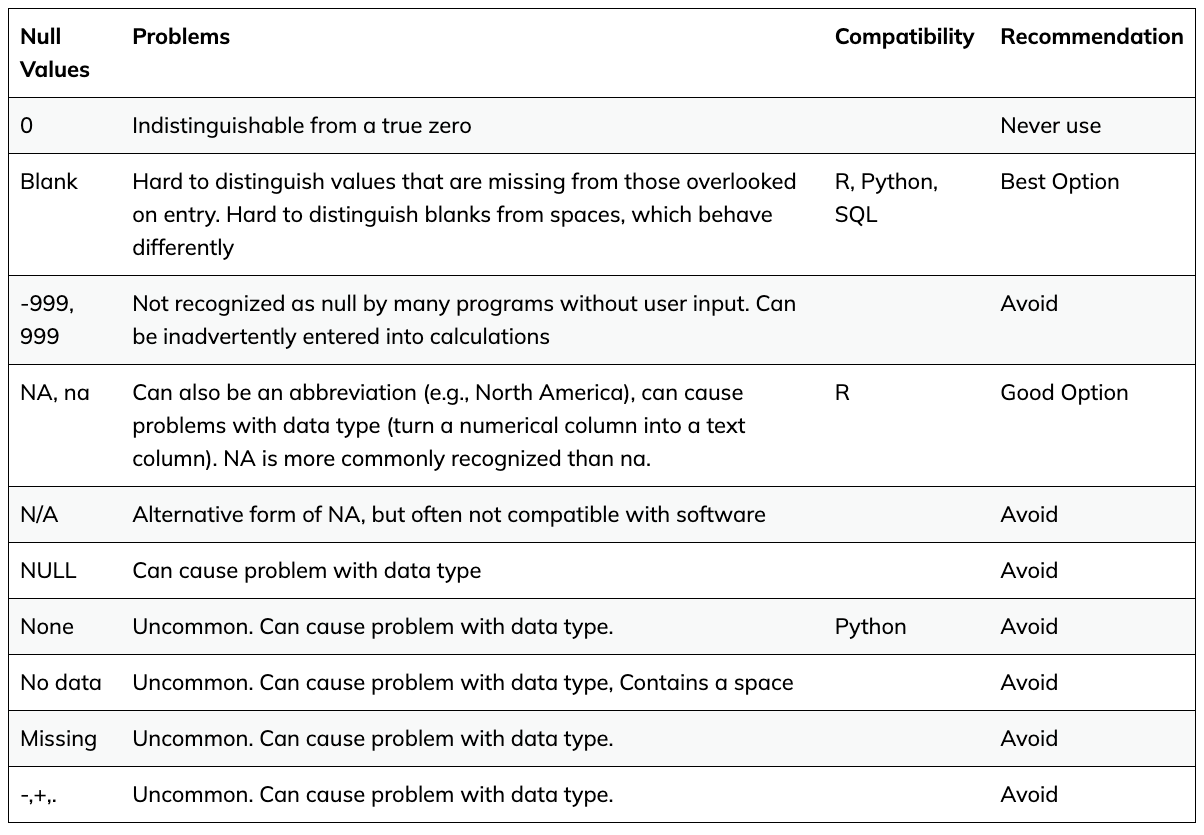 - Do not combine multiple pieces of information in one cell. Sometimes it just seems like one thing, but think if that’s the only way you’ll want to be able to use or sort that data. For example, instead of having a column with species and strain name (e.g. E. coli K12) you would have one column with the species name (E. coli) and another with the strain name (K12). Depending on the type of analysis you want to do, you may even separate the genus and species names into distinct columns.