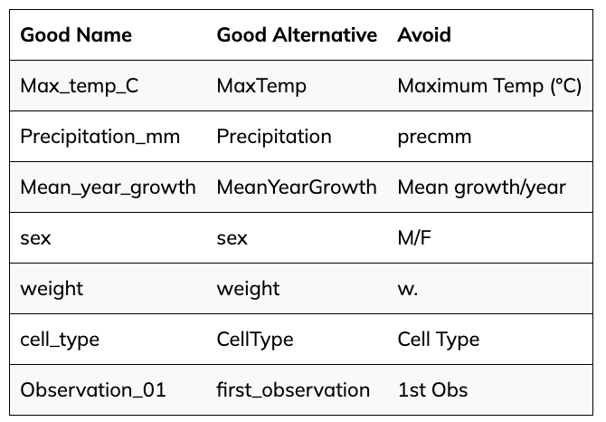 - Have column names be explanatory, but without spaces. Use ‘-’, ’_’ or camel case instead of a space. For instance ‘library-prep-method’ or ‘LibraryPrep’is better than ’library preparation method’ or ‘prep’, because computers interpret spaces in particular ways.