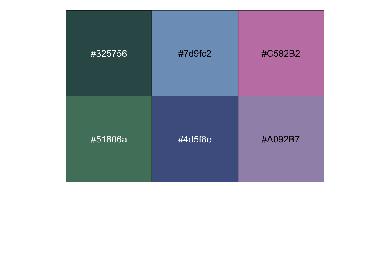 kereru [1] "#325756" "#7d9fc2" "#C582B2" "#51806a" "#4d5f8e" "#A092B7"