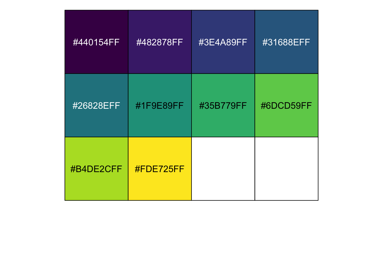 This also works for viridis, using the viridis function to display a custom number of colours from that palette: