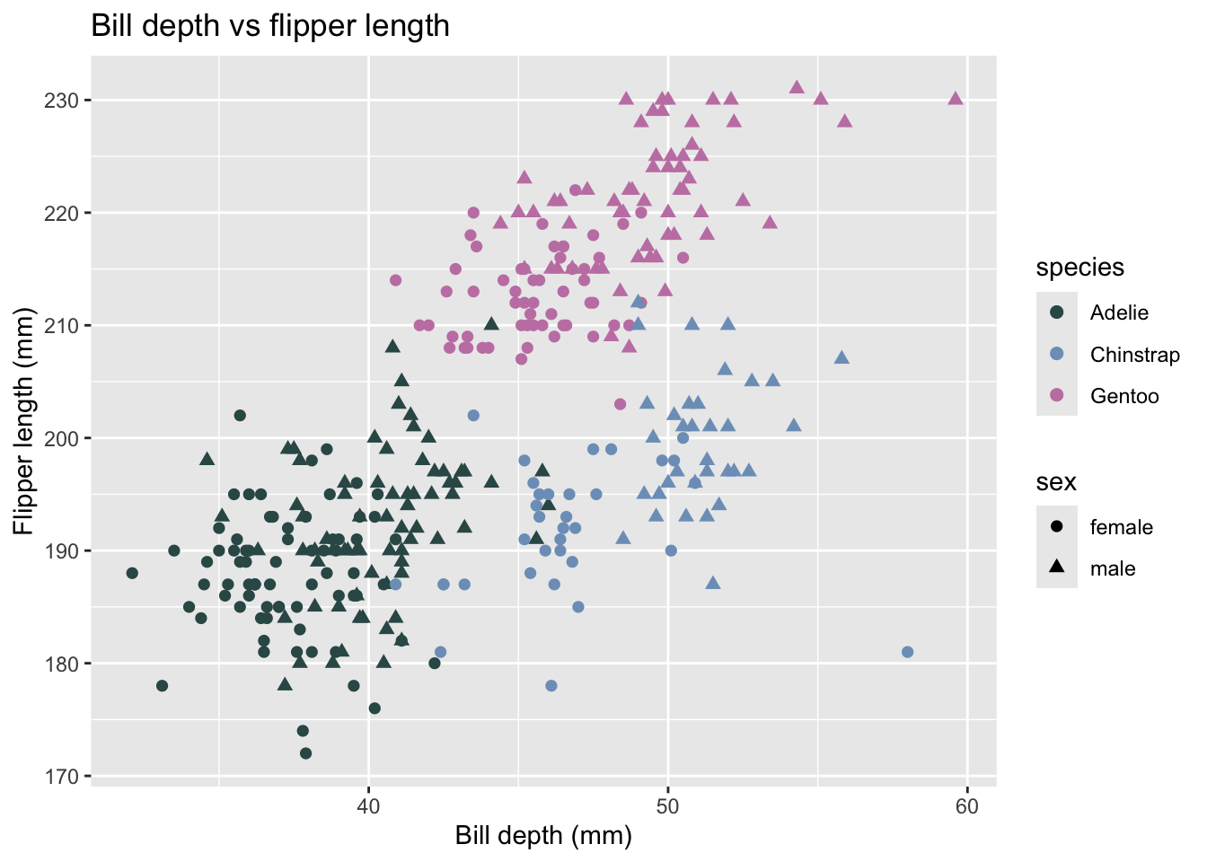 # Load the viridis library, which supplies a colour scheme that is# sensitive to colour-blindness.# install.packages("viridis")library(viridis)# New arguments map species to the colour variable, so that each point is coloured# by species.# Sex is mapped to shape. Note that shape can only take discrete variables.ggplot(data = penData,mapping =aes(x = bill_length_mm,y = flipper_length_mm,colour = species,shape = sex)) +geom_point(size =2, alpha =0.6) +# alpha is transparency of the pointsscale_colour_viridis(discrete =TRUE) +labs(x ="Bill depth (mm)",y ="Flipper length (mm)") +ggtitle("Bill depth vs flipper length")